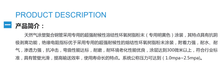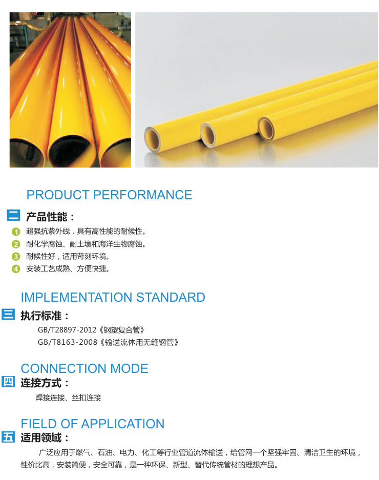 天然氣涂塑復(fù)合鋼管采用專用的超強(qiáng)耐候性溶結(jié)性環(huán)氧樹脂粉末(專用明黃色)涂裝,其特點(diǎn)具有抗明廢剝離功能,絕緣電阻指標(biāo)優(yōu)于采用專用的超強(qiáng)耐候性的熔結(jié)性環(huán)氧樹脂粉未涂裝,附著力強(qiáng),耐水、耐滲透力強(qiáng)